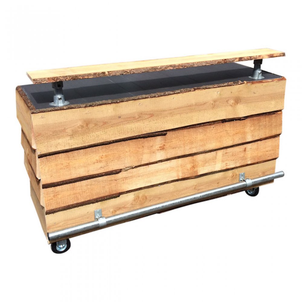 Uitermate geschikt voor het uitserveren van drank of eten. Door de natuurlijke elementen zoals hout, natuursteen en metaal is dit een super stoere uitgifte bar om te huren! De bar is makkelijk op elke gewenste plek te plaatsen door de zwenkwielen. De afmetingen zijn 185 cm. breed, 102 cm. hoog en de diepte bedraagt 72 cm.